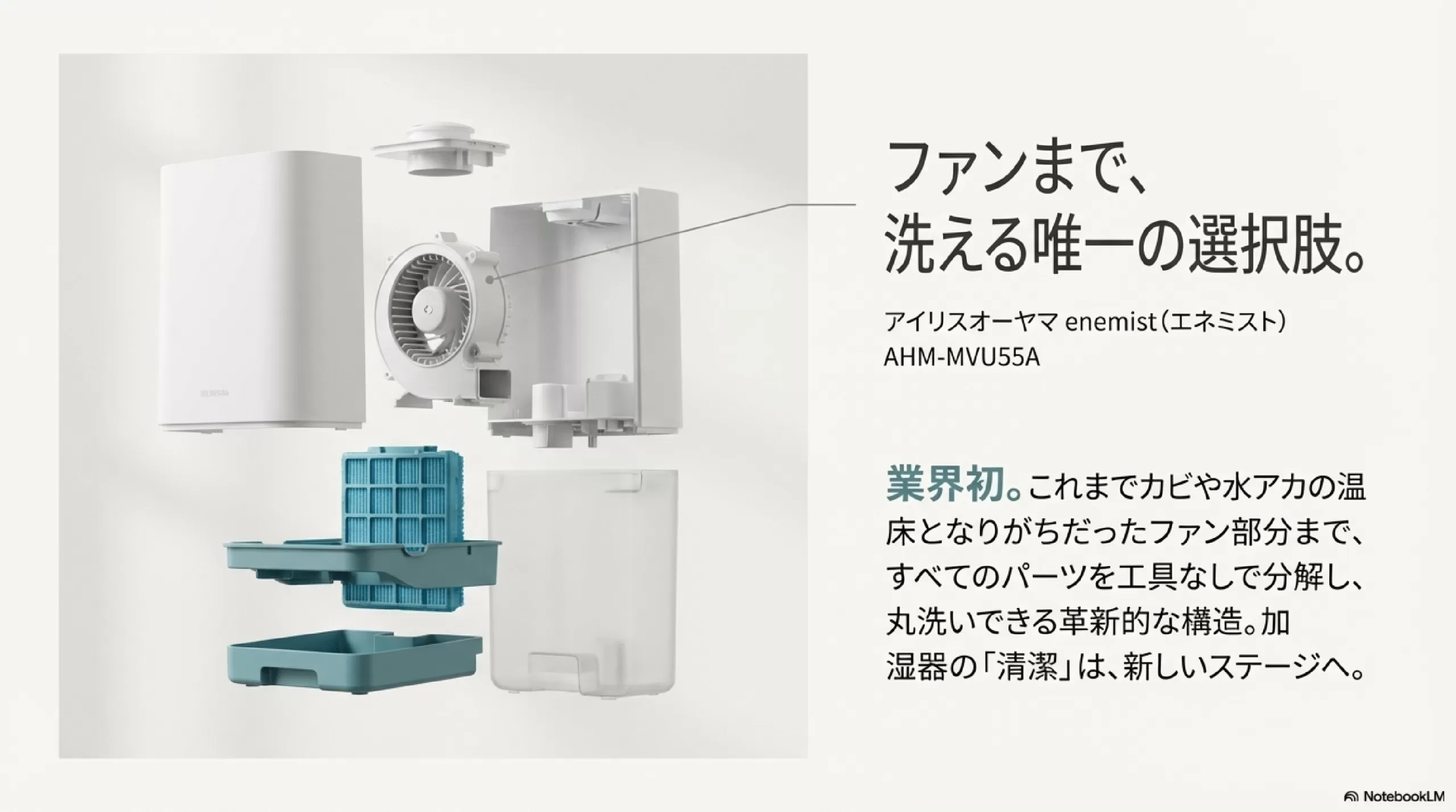 アイリスオーヤマ enemist AHM-MVU55Aは、「加湿器=不潔になりやすい」という長年の常識を覆した革命的な一台です。