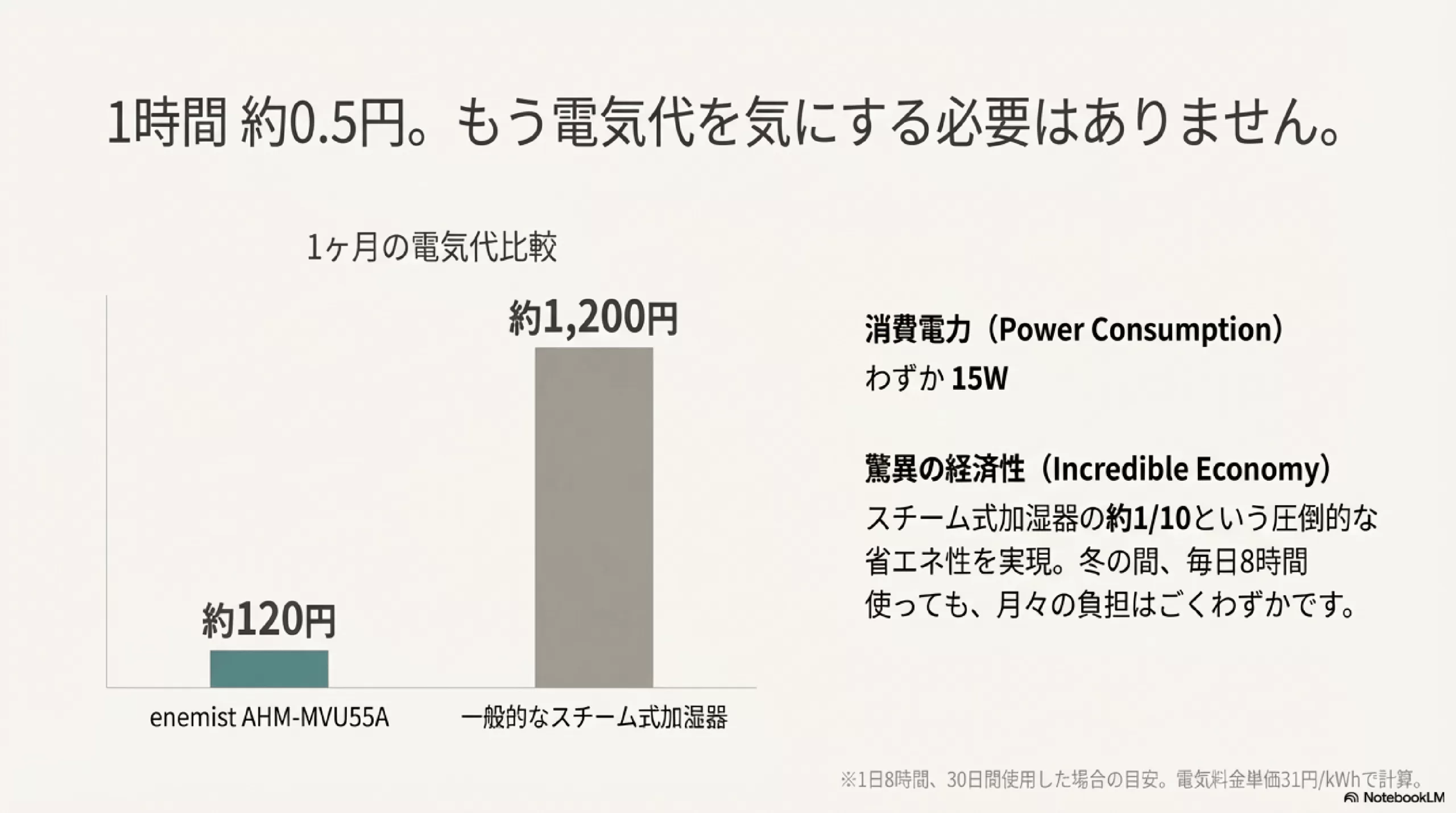 驚異の省エネ:電気代は1時間約0.5円。一日中使っても財布に優しい。