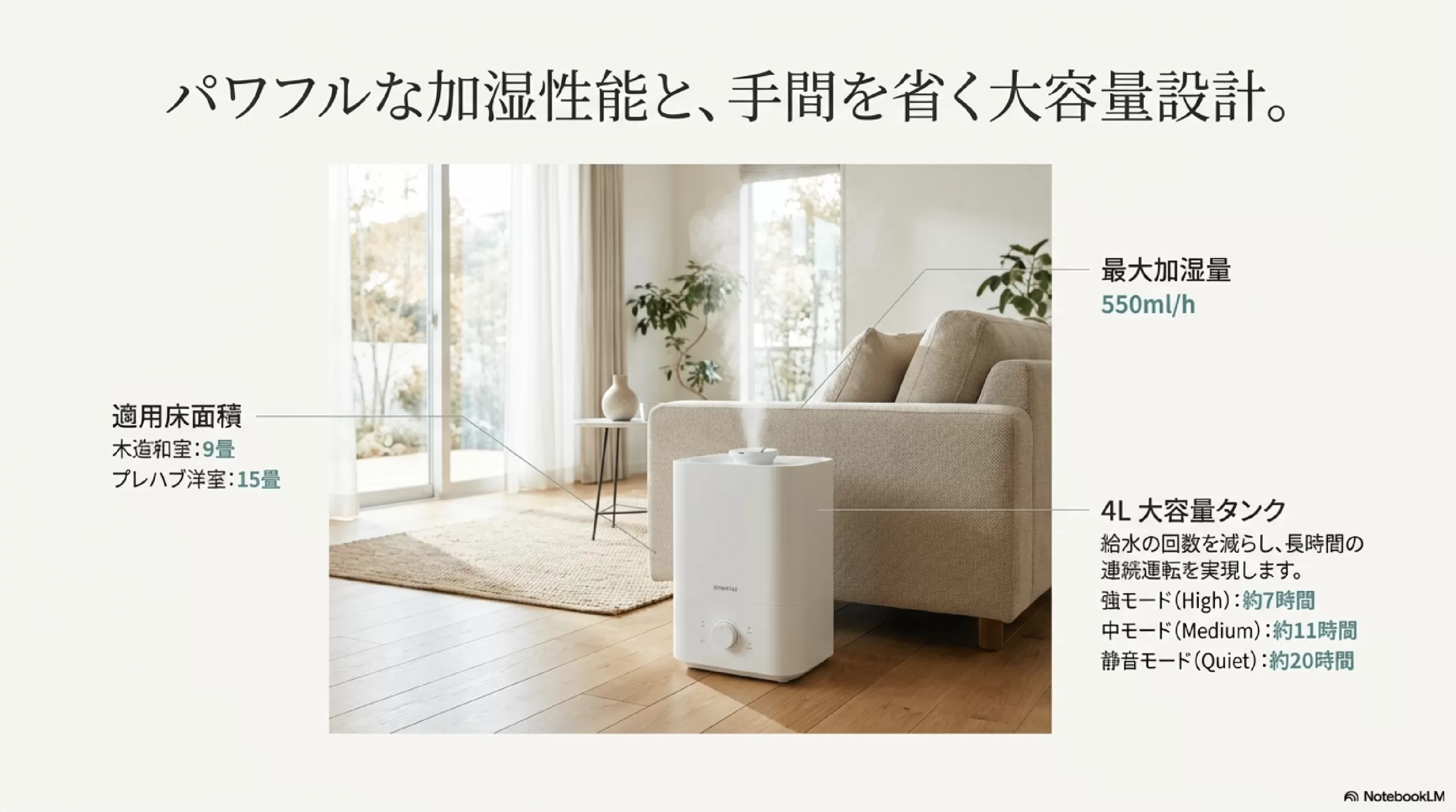 「上から給水」と「4Lタンク」の組み合わせは、忙しい朝や疲れて帰ってきた夜の手間を大幅に減らしてくれます。タンクを外して洗面所へ行くという動作がなくなるだけで、加湿器を使うハードルはぐっと下がります。