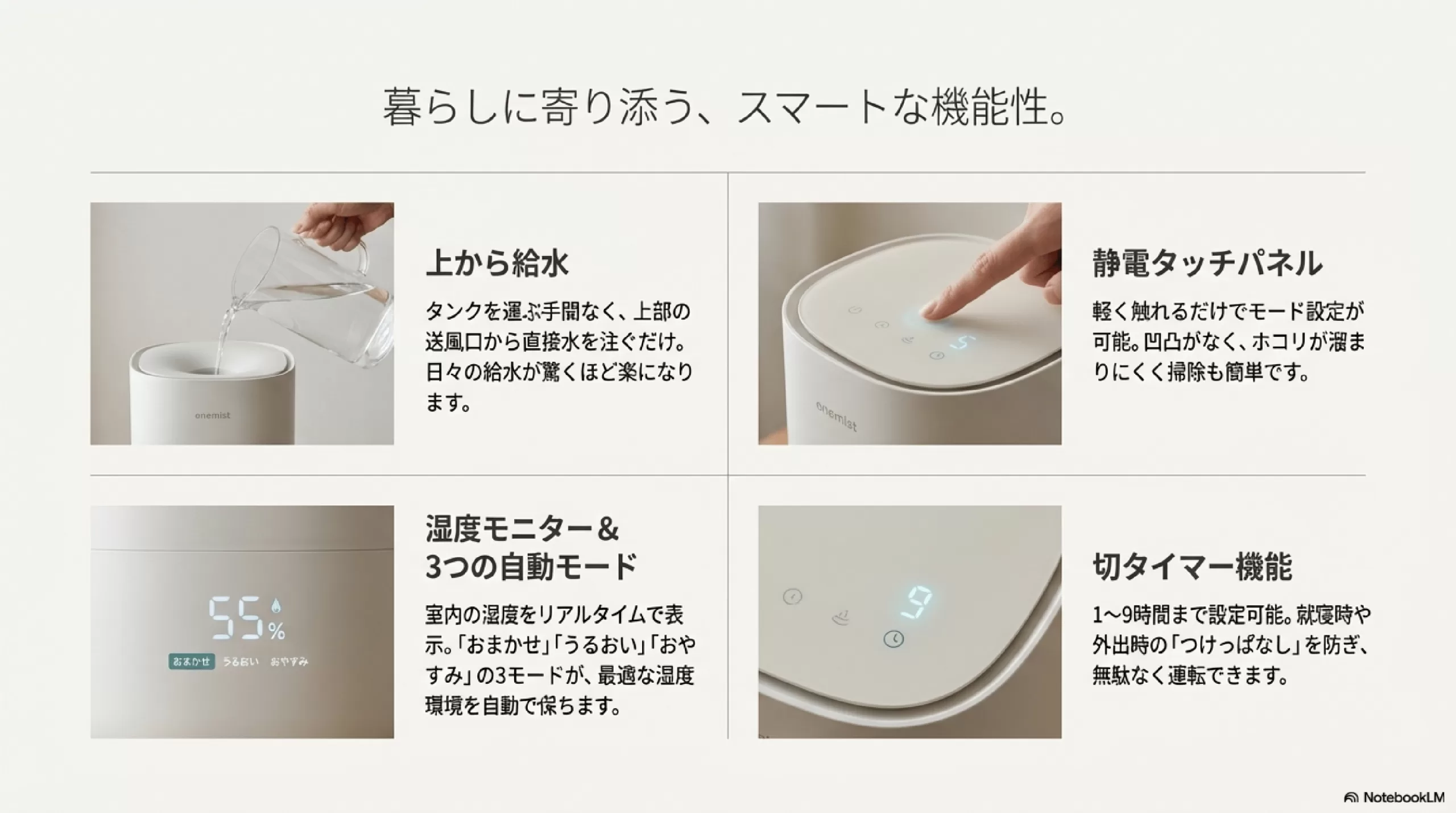 数ある加湿器の中でなぜ今「enemist」が注目されているのか。その理由はユーザーが長年抱えてきたストレスを的確に解消している点にあります。ここでは5つのポイントに絞ってその魅力を深掘りします。