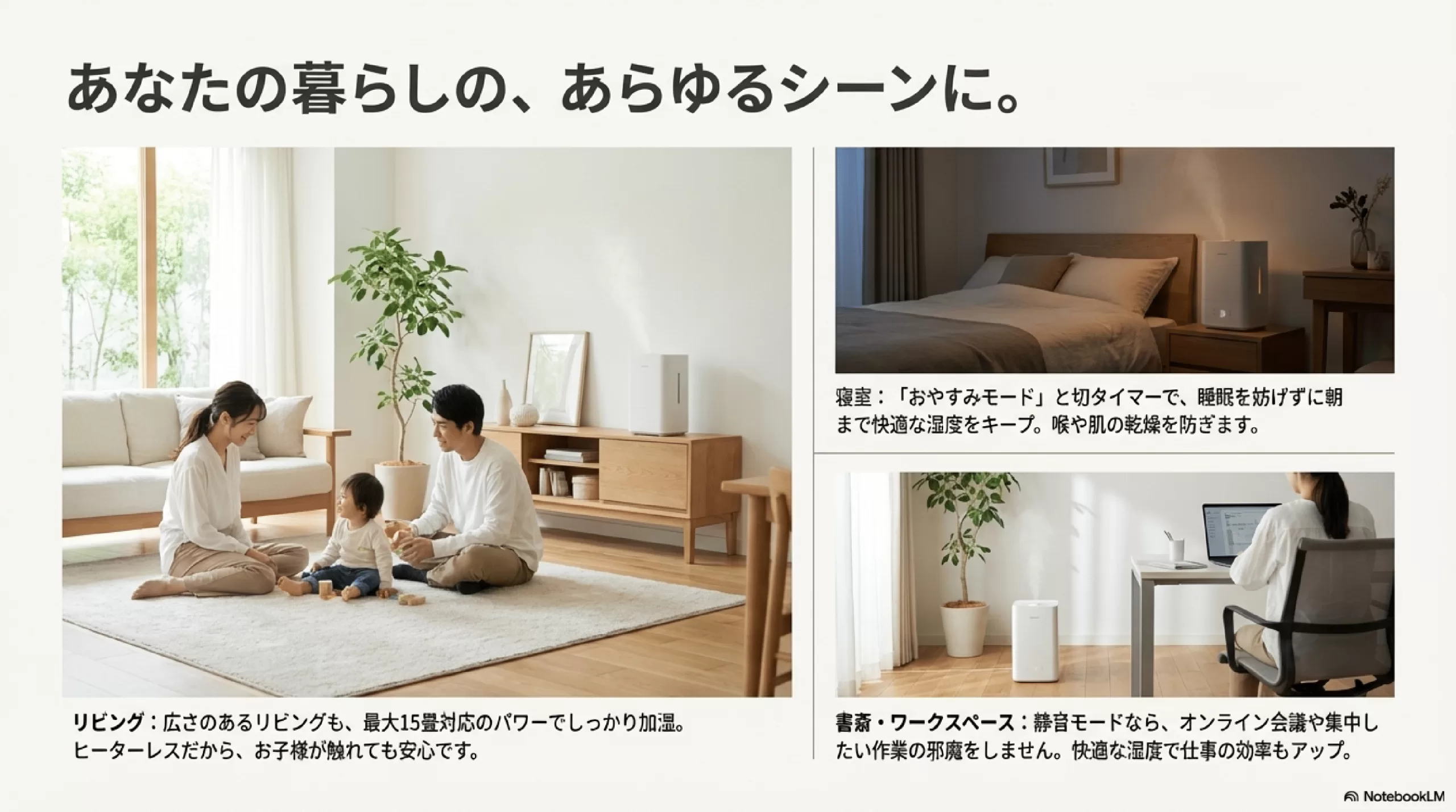 子育て世帯やペットがいる家庭:安全性を確保しつつ適切な湿度環境を作りたい方にぴったりです。