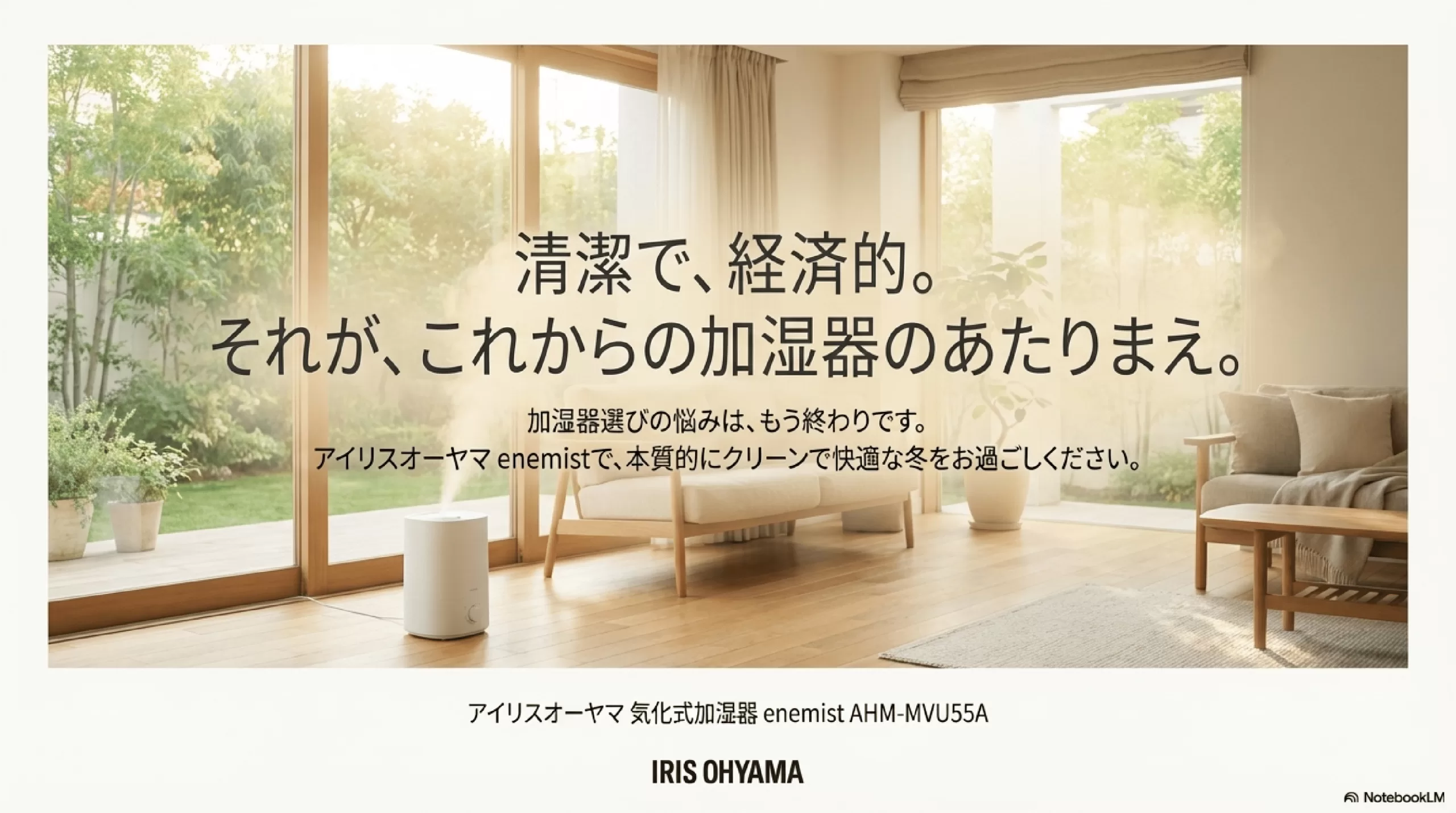 実は多くの人が抱えるこの不潔・面倒・高コストという三重苦を、驚くべきアイデアで解決した製品が登場しました。それがアイリスオーヤマの気化式加湿器「enemist(エネミスト)AHM-MVU55A」です。
